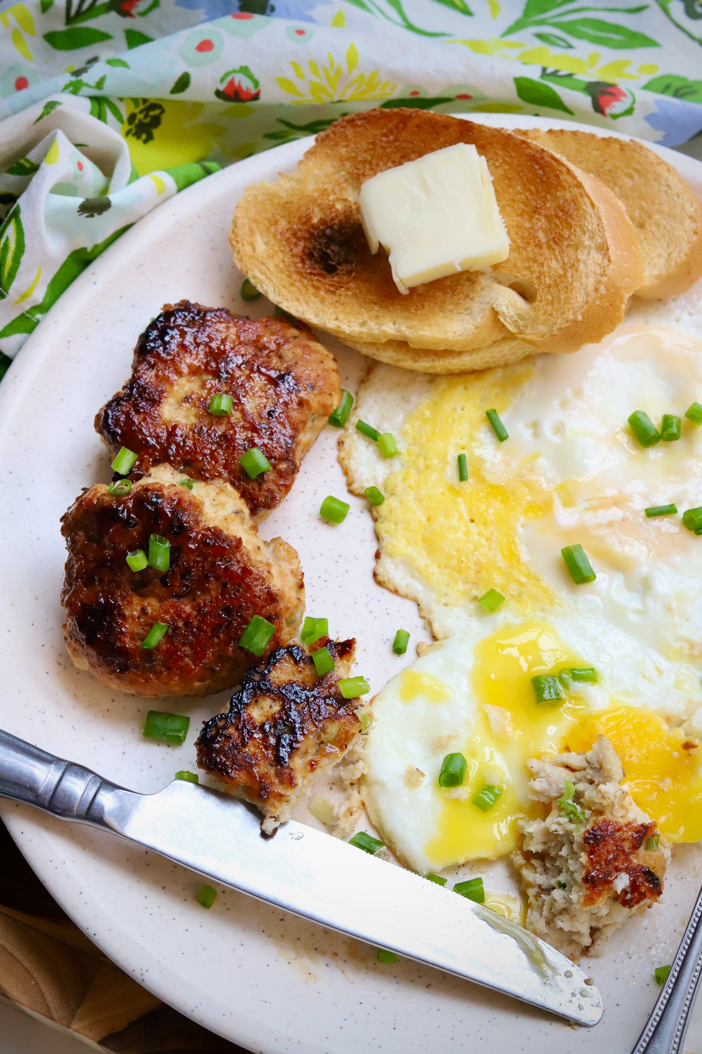 Breakfast Plate with homemade sausage, toast, and eggs.